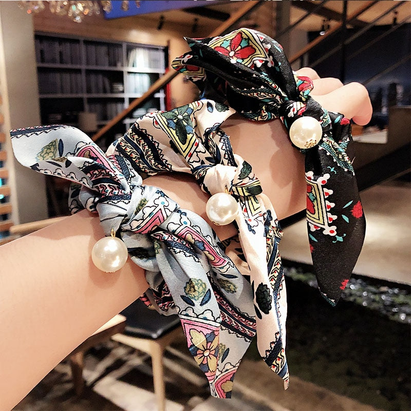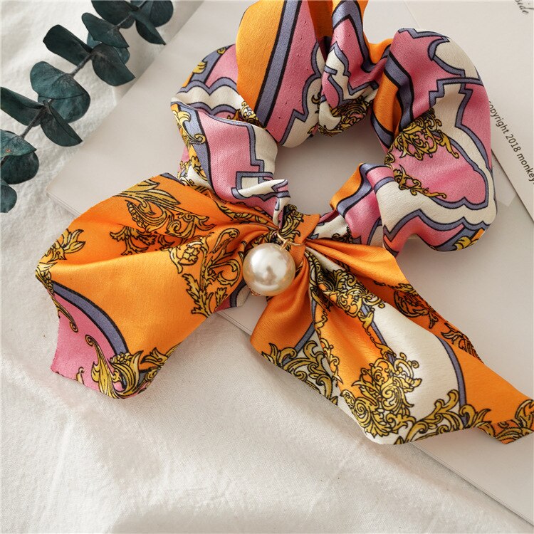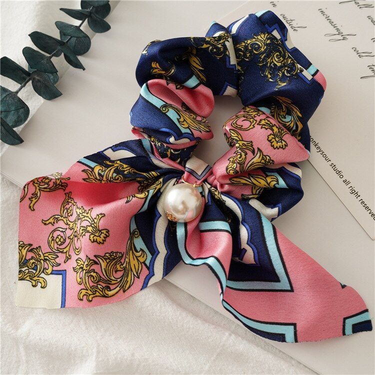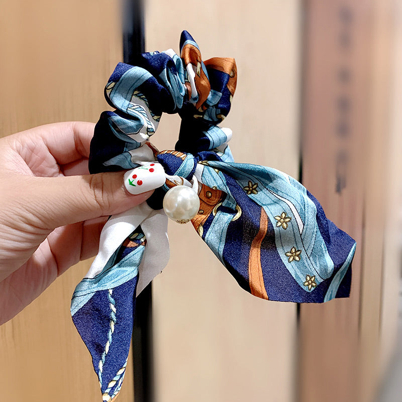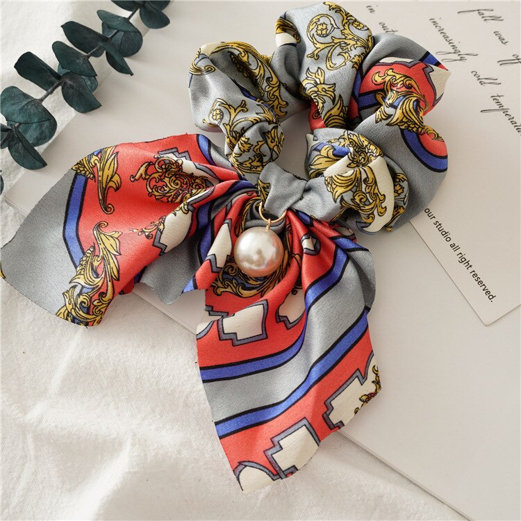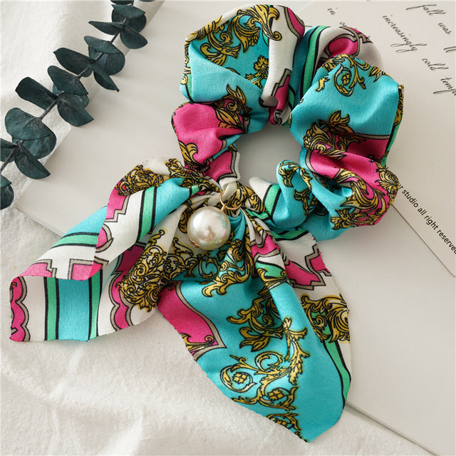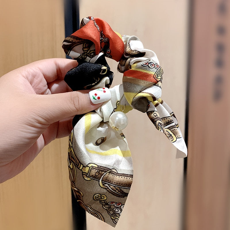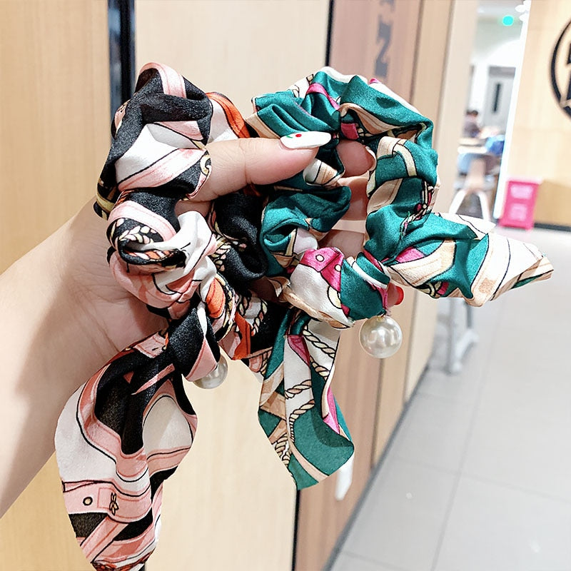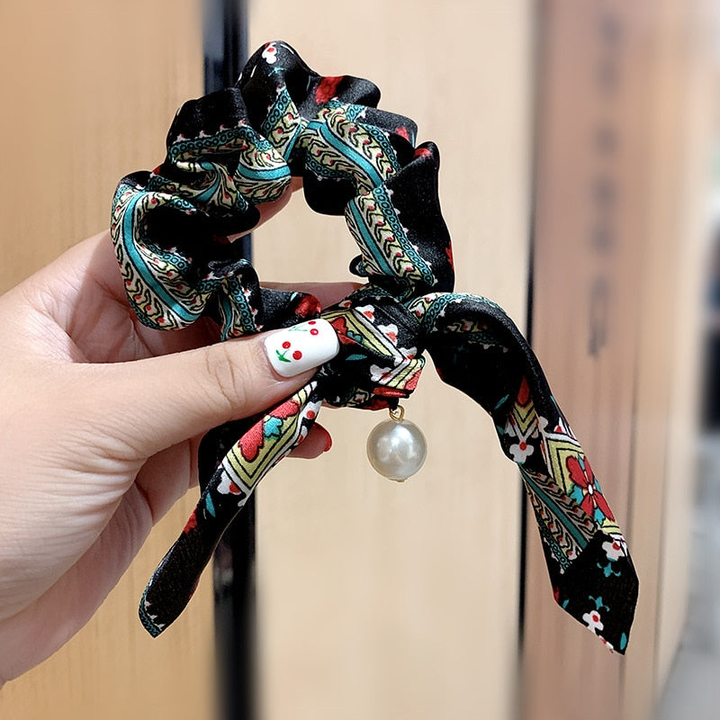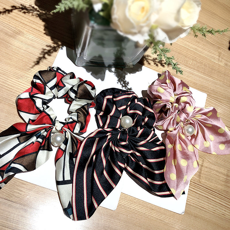 Belle Trending Satin Print Pearl Bow Tie Ribbon Scrunchie Hair Jewelry