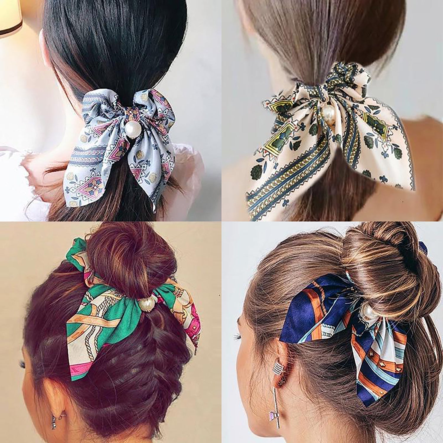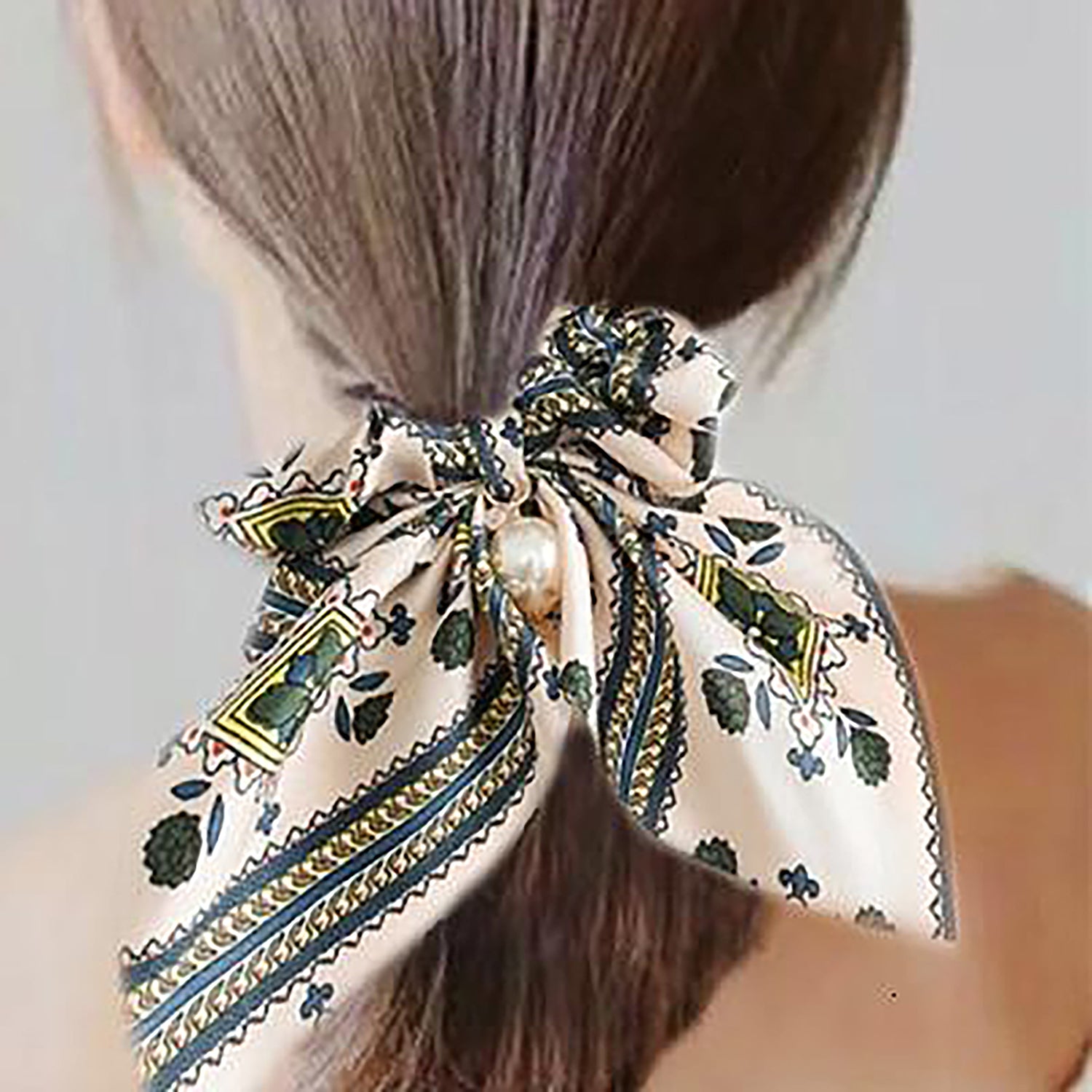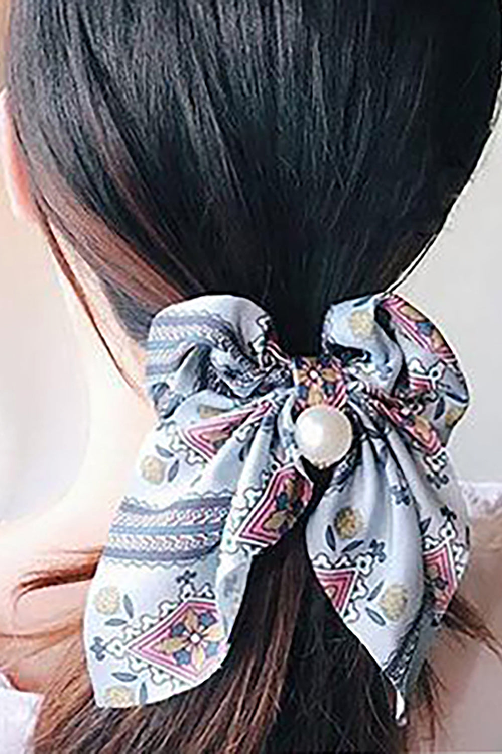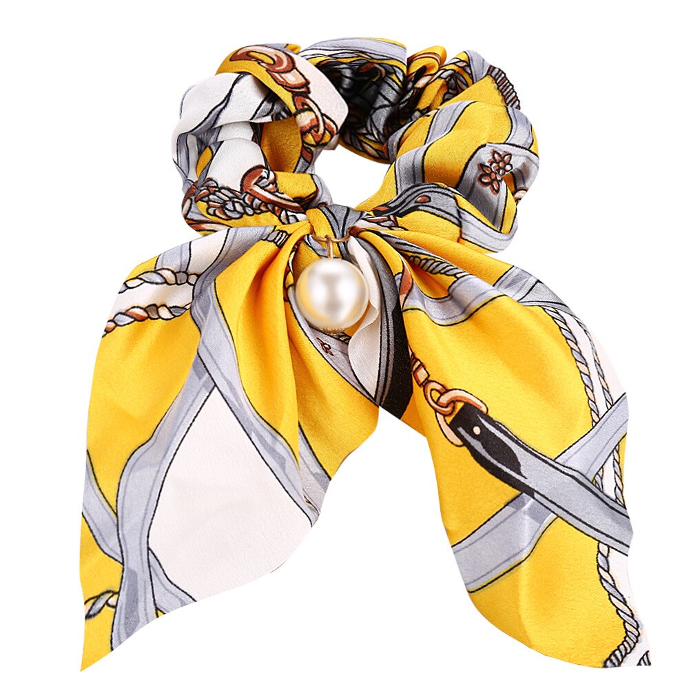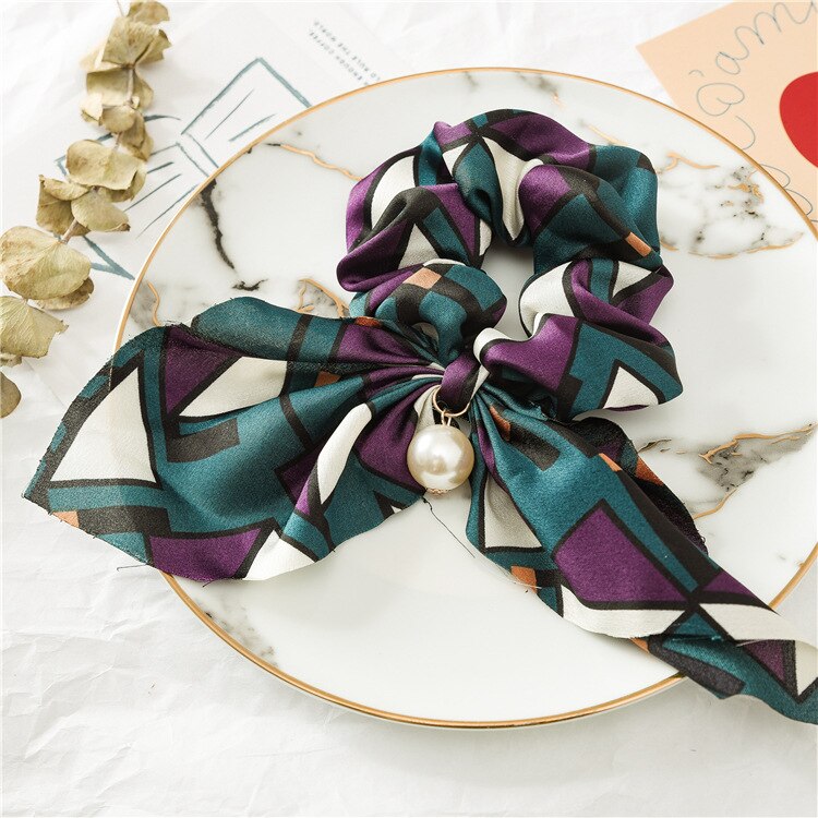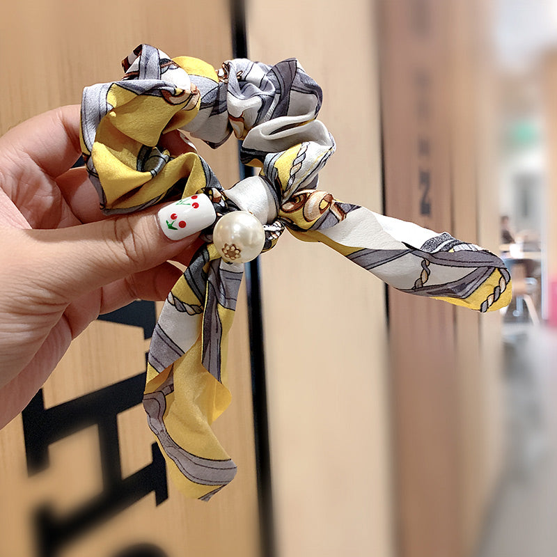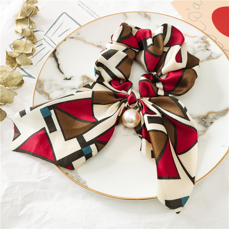 Belle Trending Satin Print Pearl Bow Tie Ribbon Scrunchie Hair Jewelry