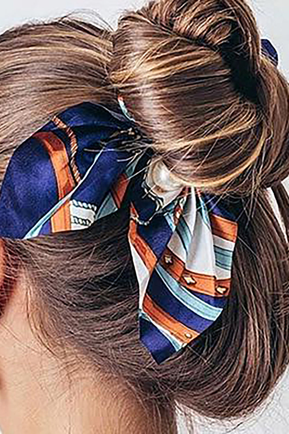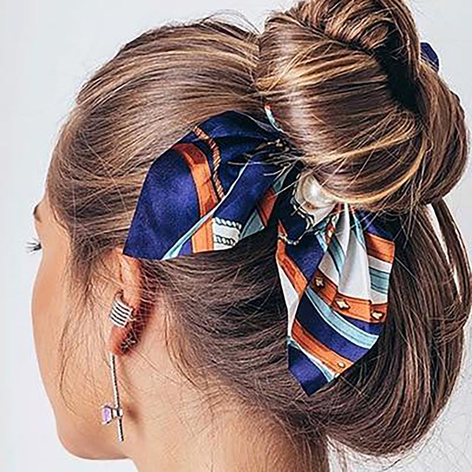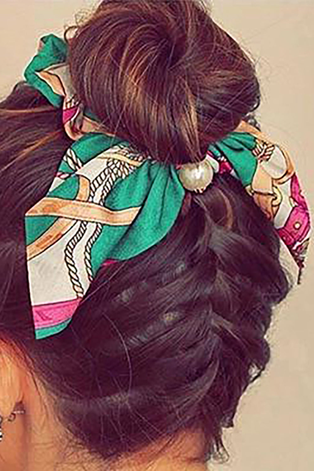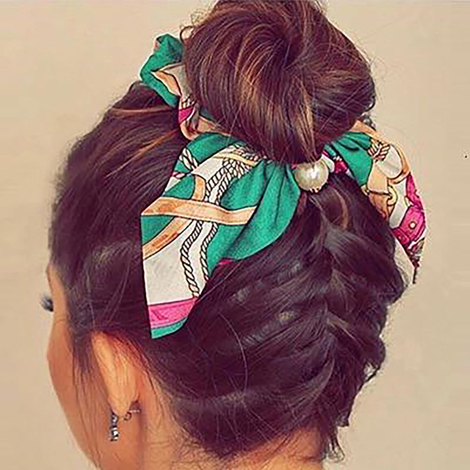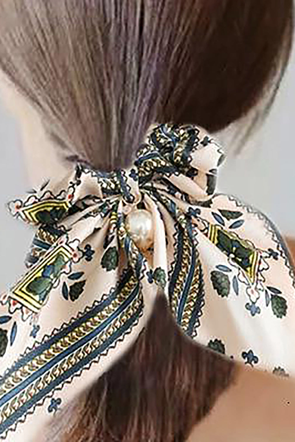 Belle Trending Satin Print Pearl Bow Tie Ribbon Scrunchie Hair Jewelry