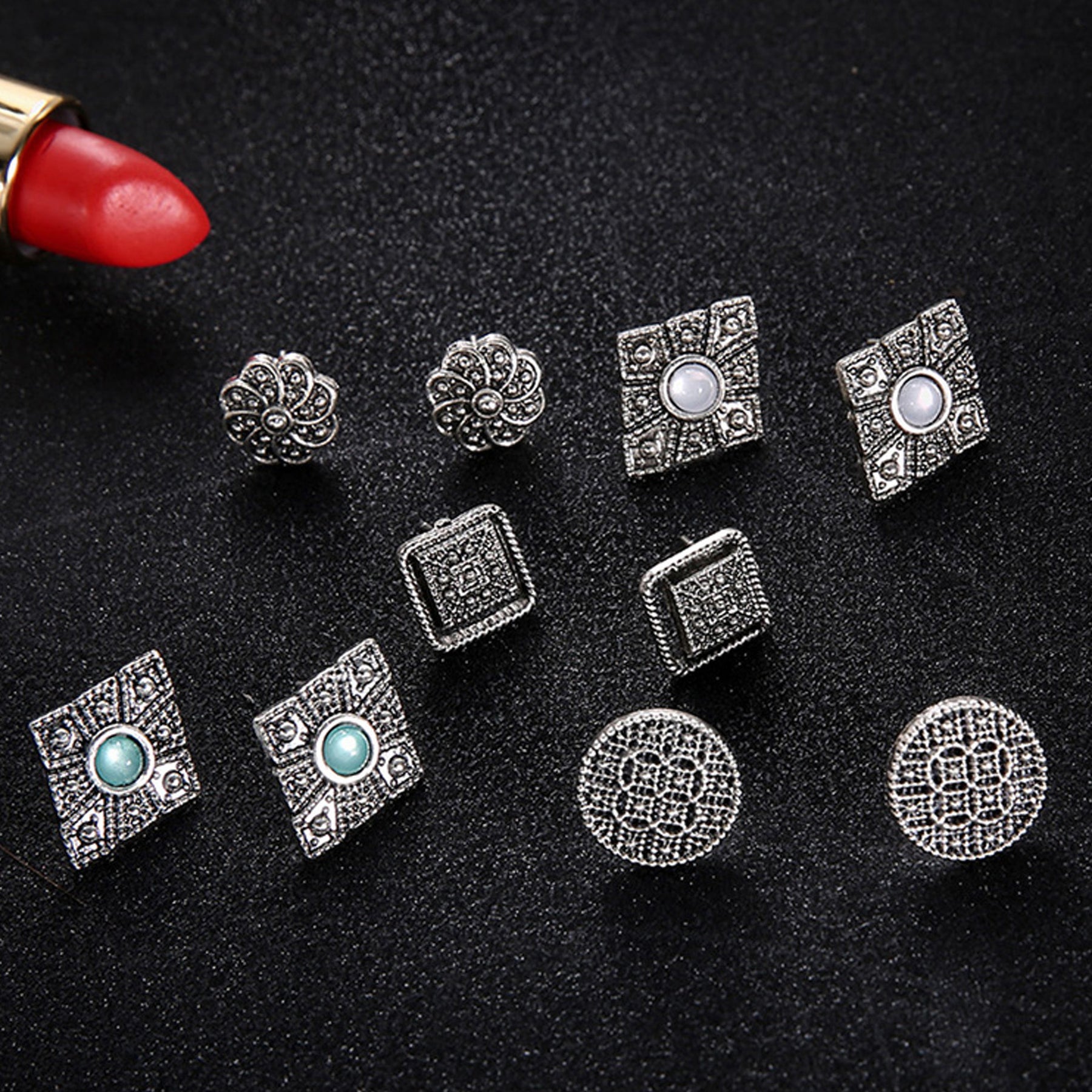 Gwen Vintage Victorian Cat Eye Opal Ear Piercing Earring Studs Set 5 Pairs in Antiqued Silver