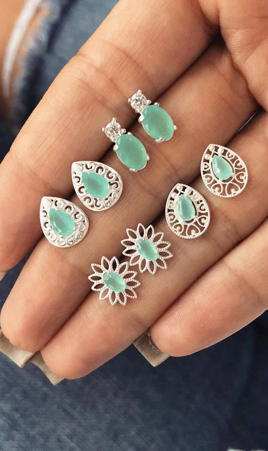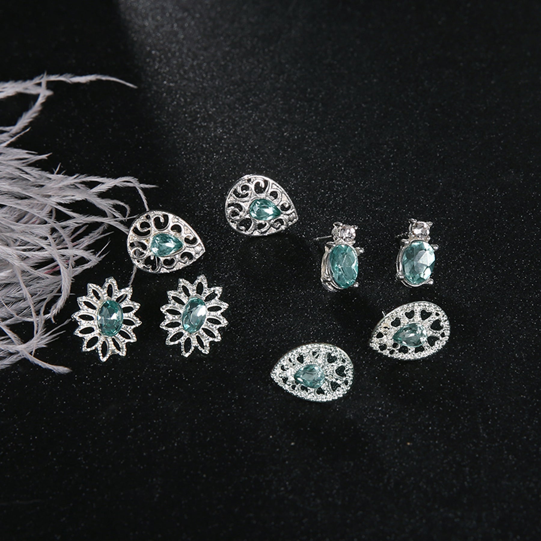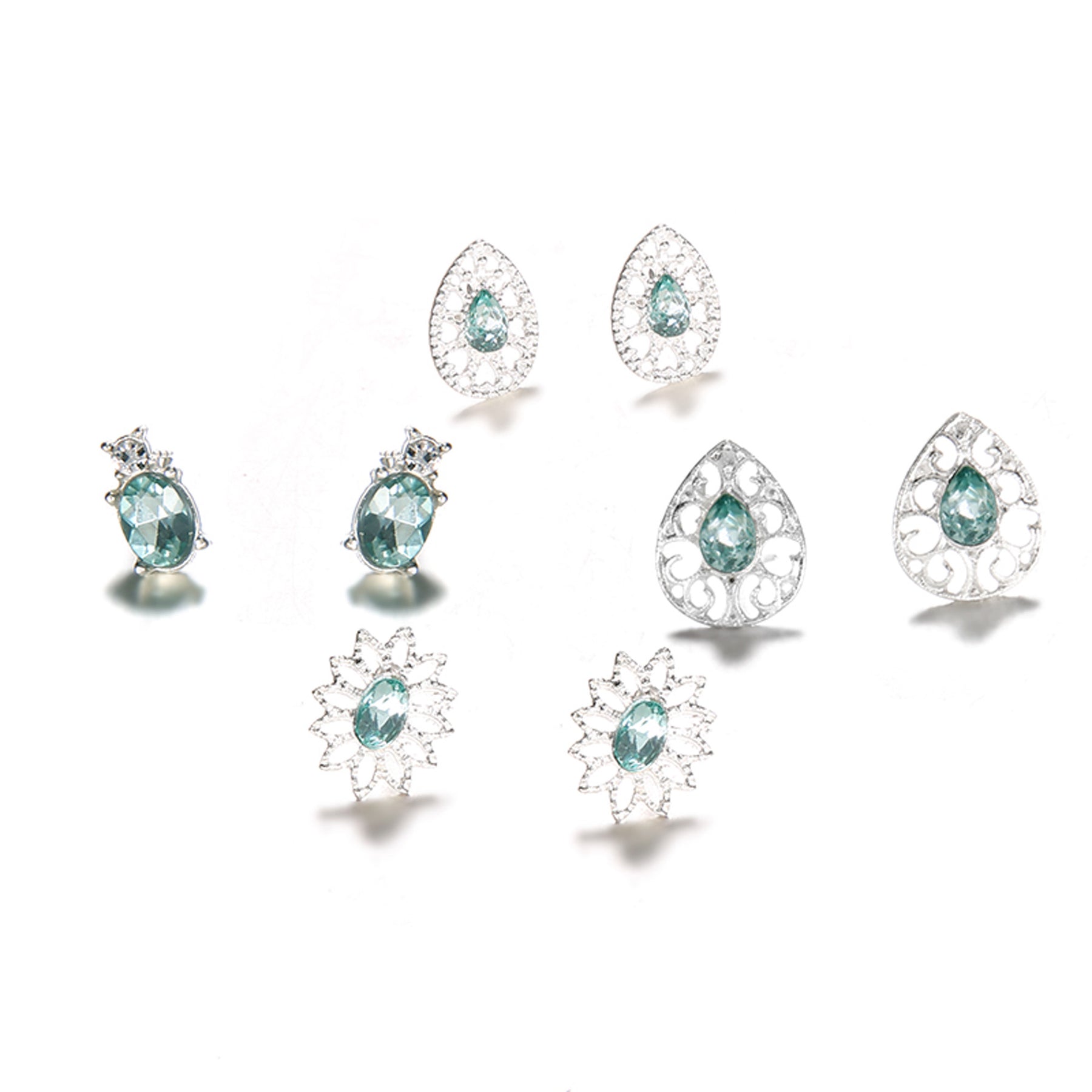 Haven Trendy Green Crystal Victorian Ear Piercing Earring Studs Set 4 Pairs in Silver