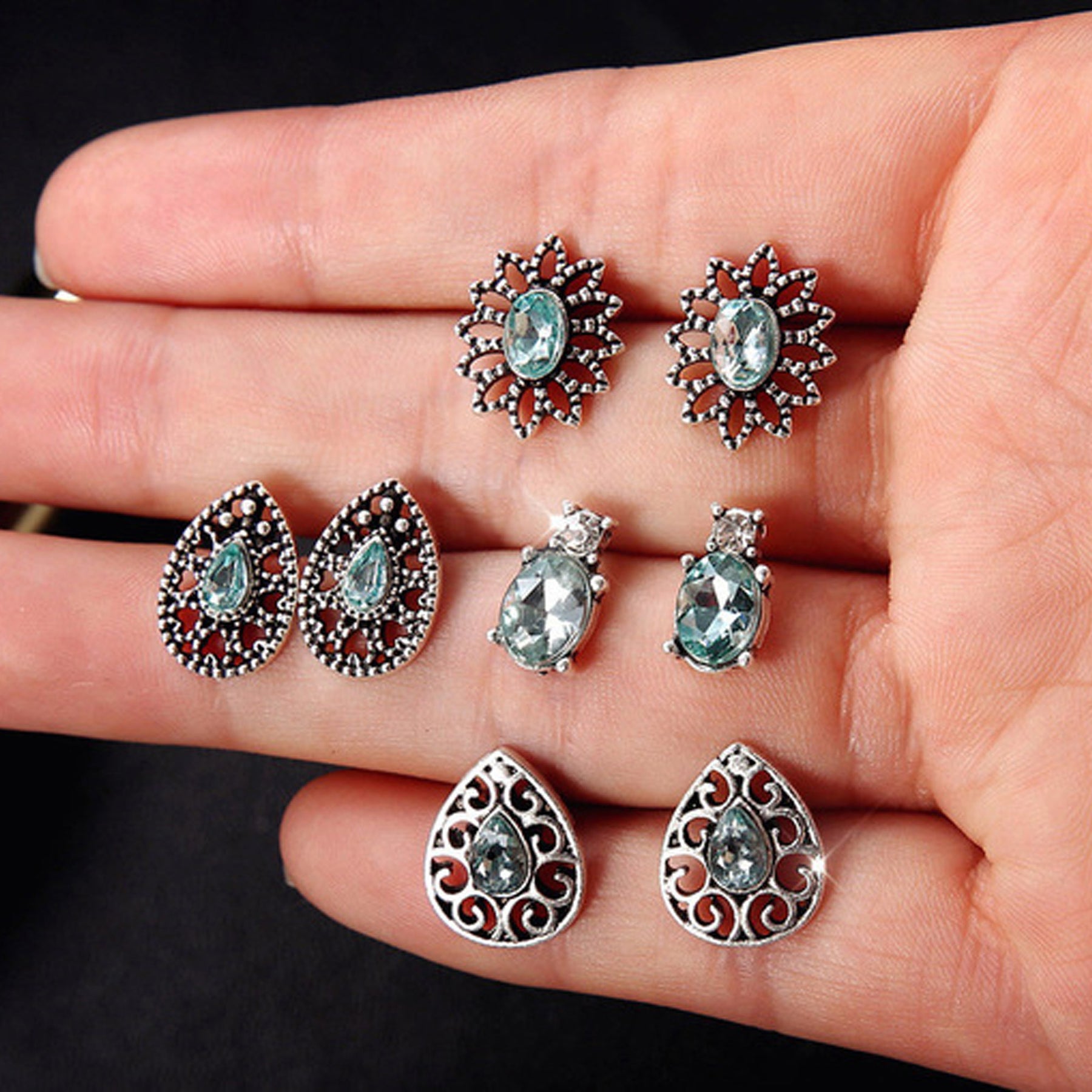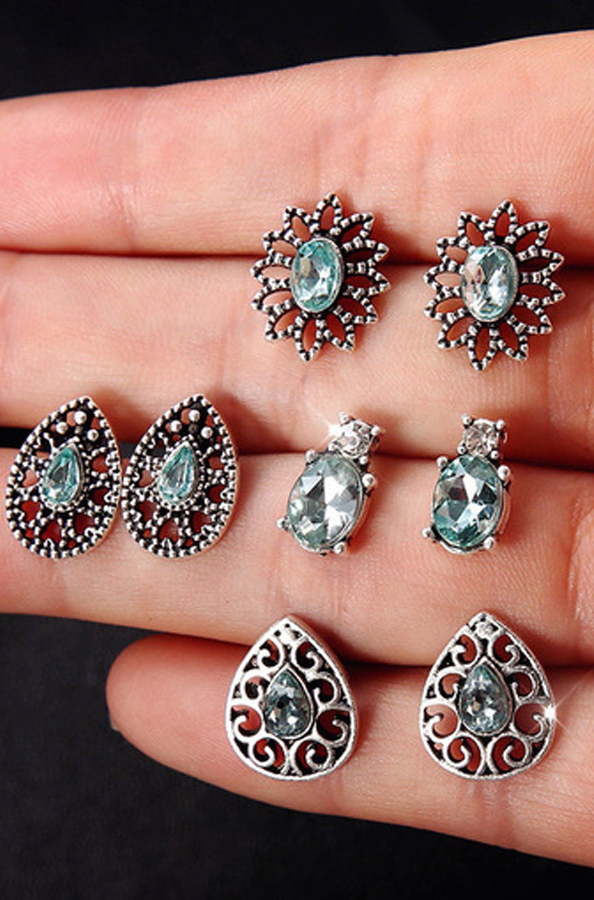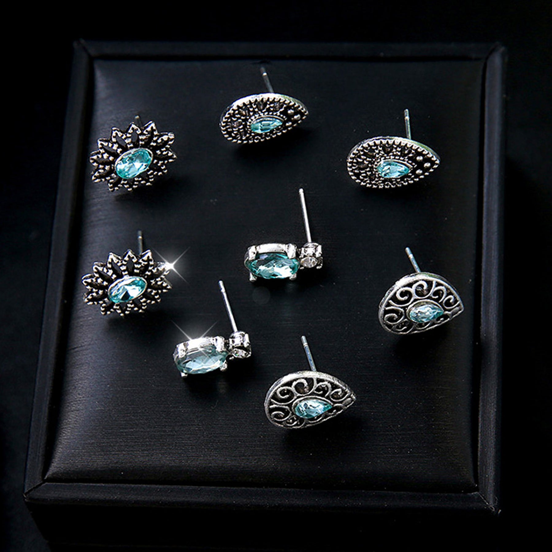 Haven Trendy Green Crystal Victorian Ear Piercing Earring Studs Set 4 Pairs in Silver