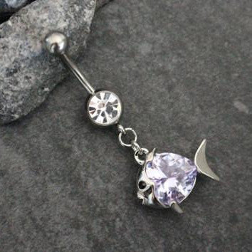 Crystal Belly Button Ring | Fish Navel Piercing | Cubic Zircon | Sparkly Gemmed Piercing | w/ High Shine Purple Lilac Clear Blue Crystals