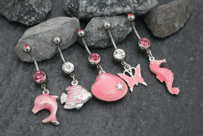 Pink Belly Ring, Seashell Belly Button Rings, Dolphin Navel Piercing, Silver Butterfly Navel Ring, Seahorse Belly Button Jewelry Fish Ocean