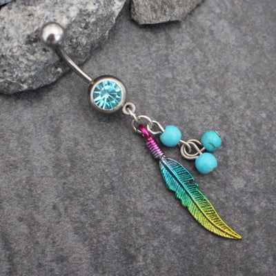 Leaf Belly Button Jewelry | Feather Navel Ring Boho Tribal | 14G Gauge Stainless Surgical Steel w/ Beads | w/ High Shine Crystals