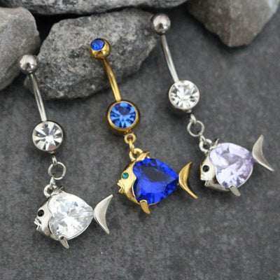 Diamante Fish Crystal Belly Button Ring in Silver or Gold w/ High Shine Purple Clear Blue Crystals