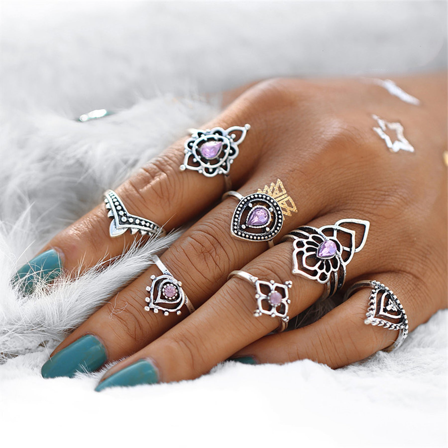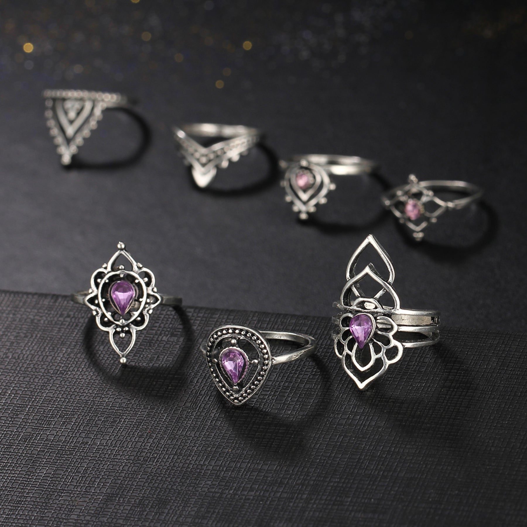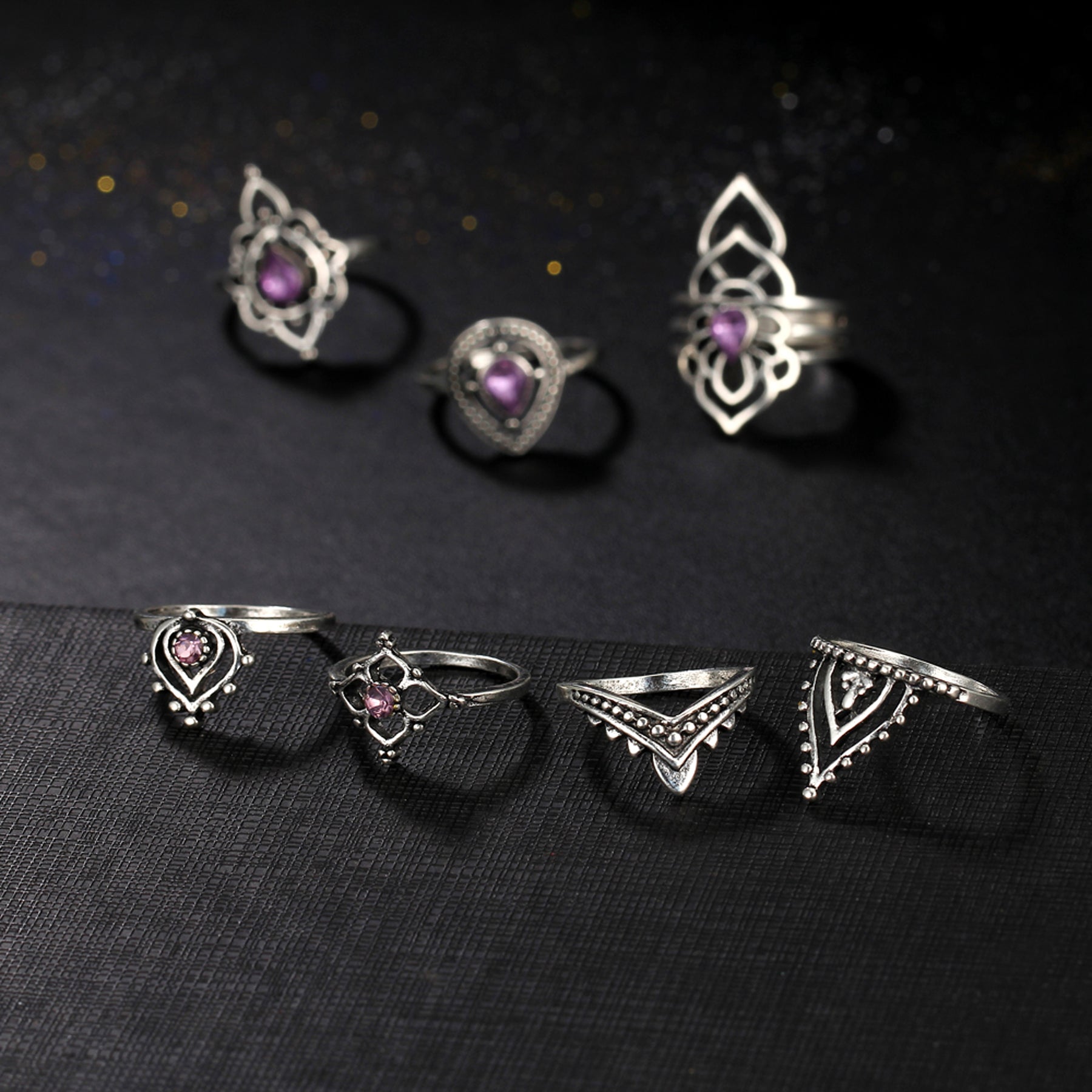 Kapa Boho Antiqued Vintage Silver Purple Crystal Rings Set 7 Pieces