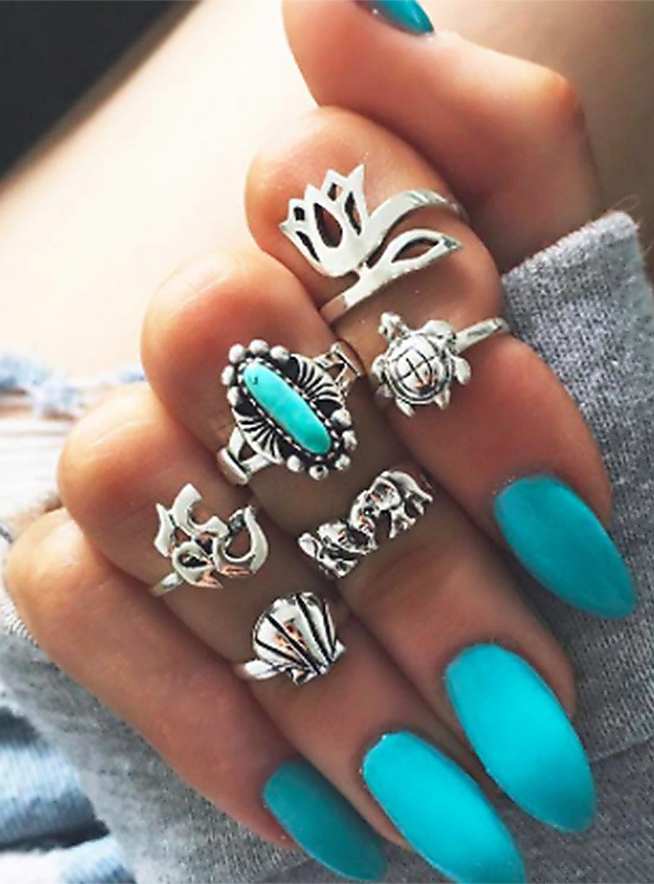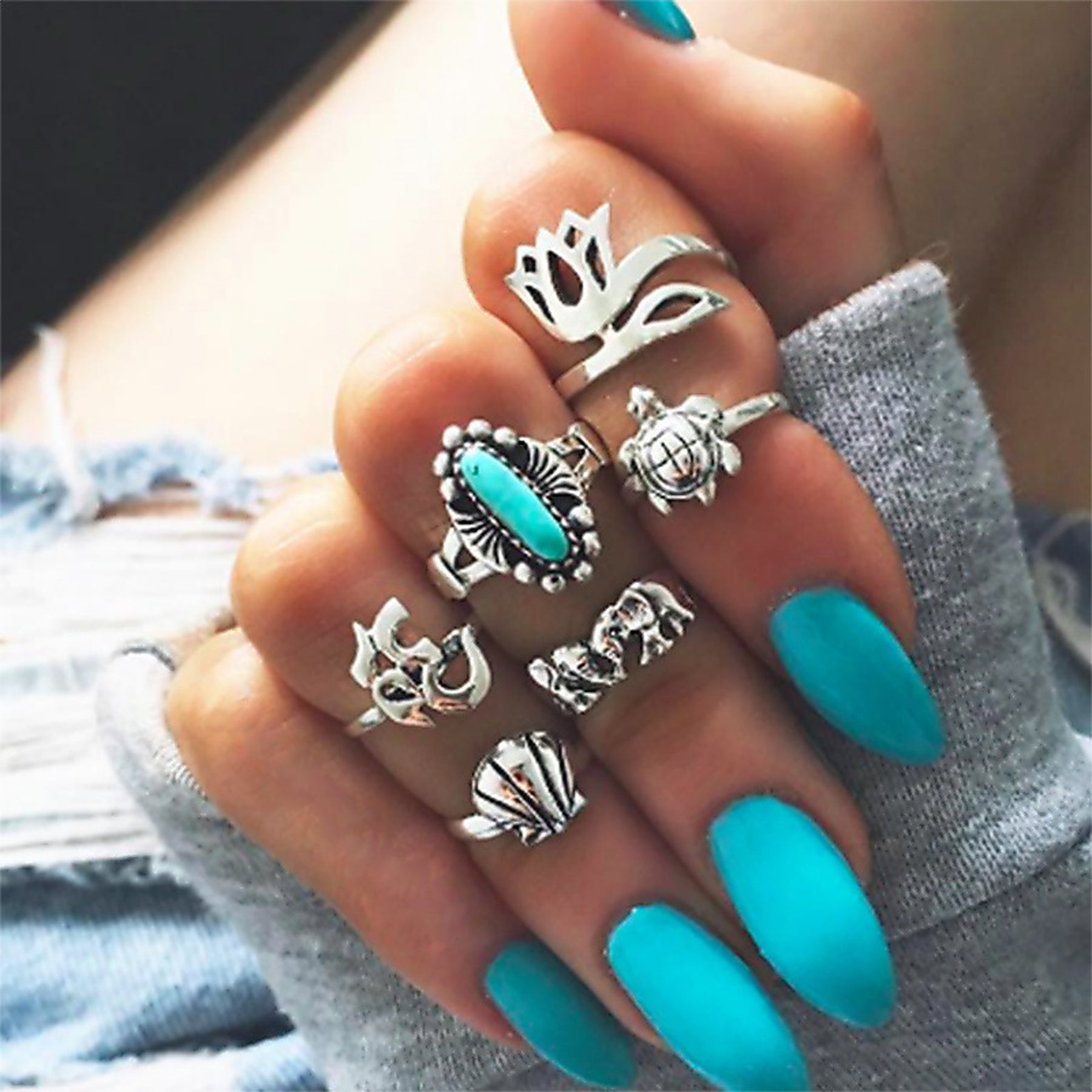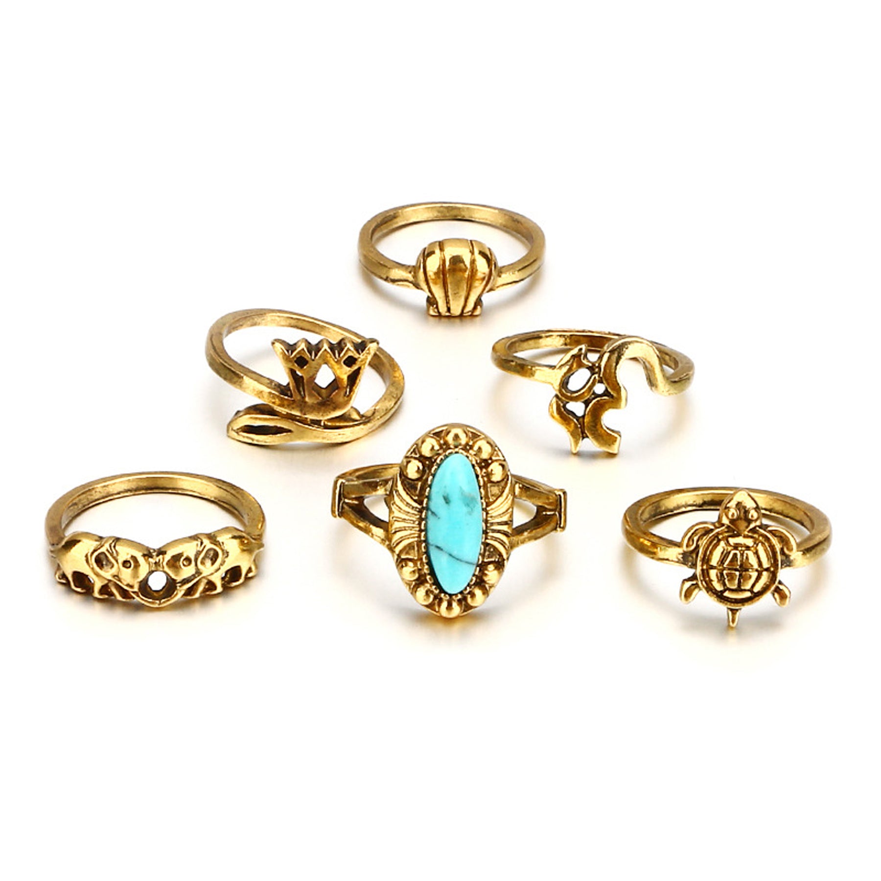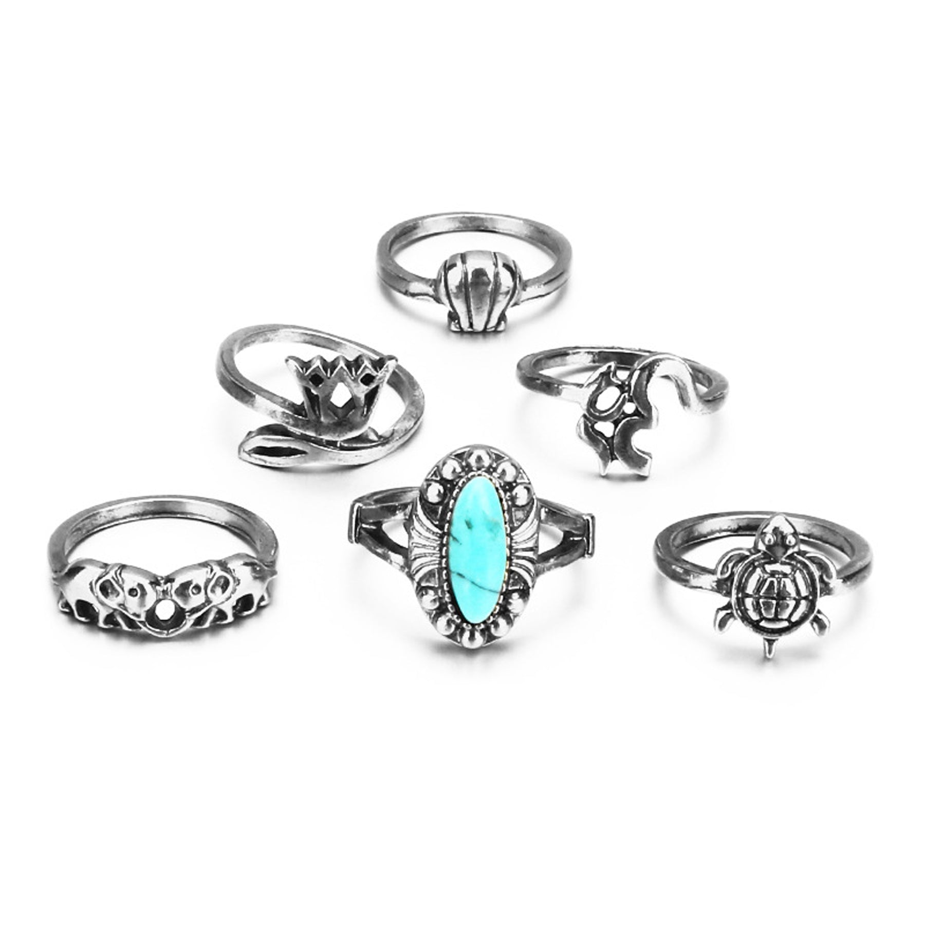 Kimin Boho Antiqued Silver Turtle Elephant Seashell Lotus Turquoise Ring Set 6 Pieces
