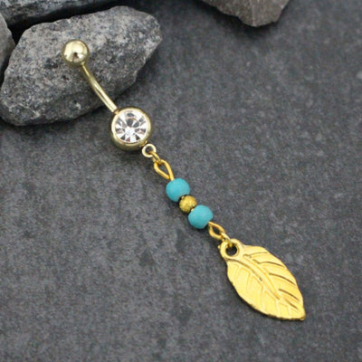 Regular price $21.99 USDGold Leaf Belly Button Ring w/ Precious Turquoise Beads - Sparkle your way into style this summer with this super cute belly button ring! Hand crafted with only the finest crystals & materials, this belly button ring will be sure to turn heads!