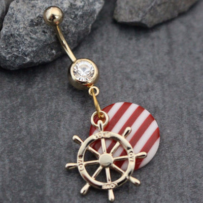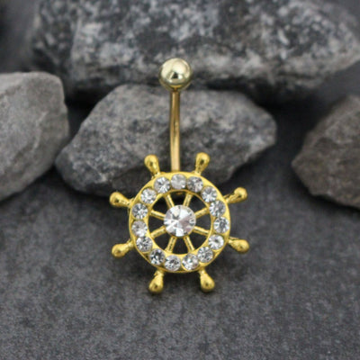Gold Wheel Belly Bar, Navel Bar, Rudder Non Dangle Body Jewelry Anchor Navel Ring Sea Nautical Charm | w/ Super Sparkle Clear Crystals