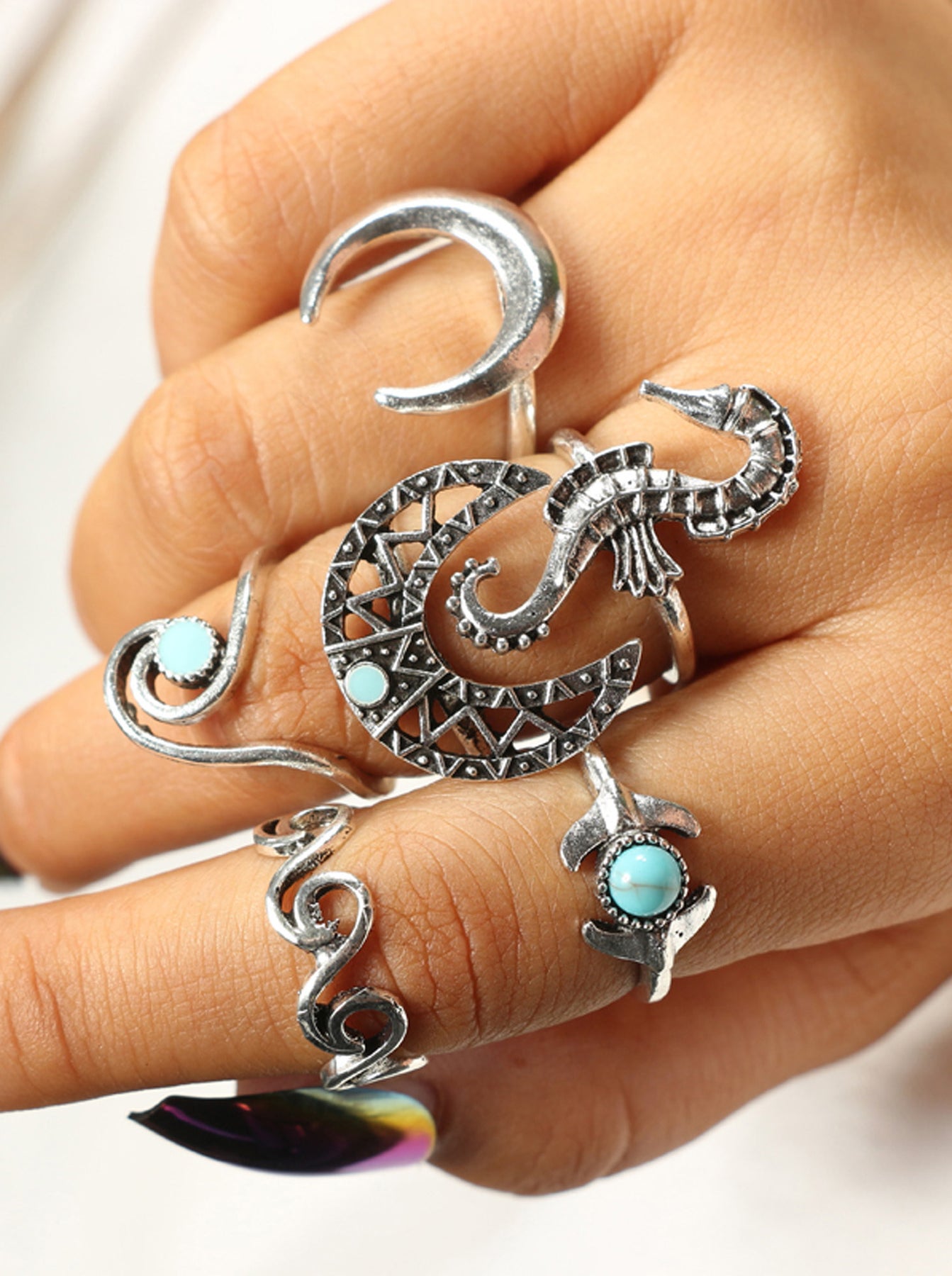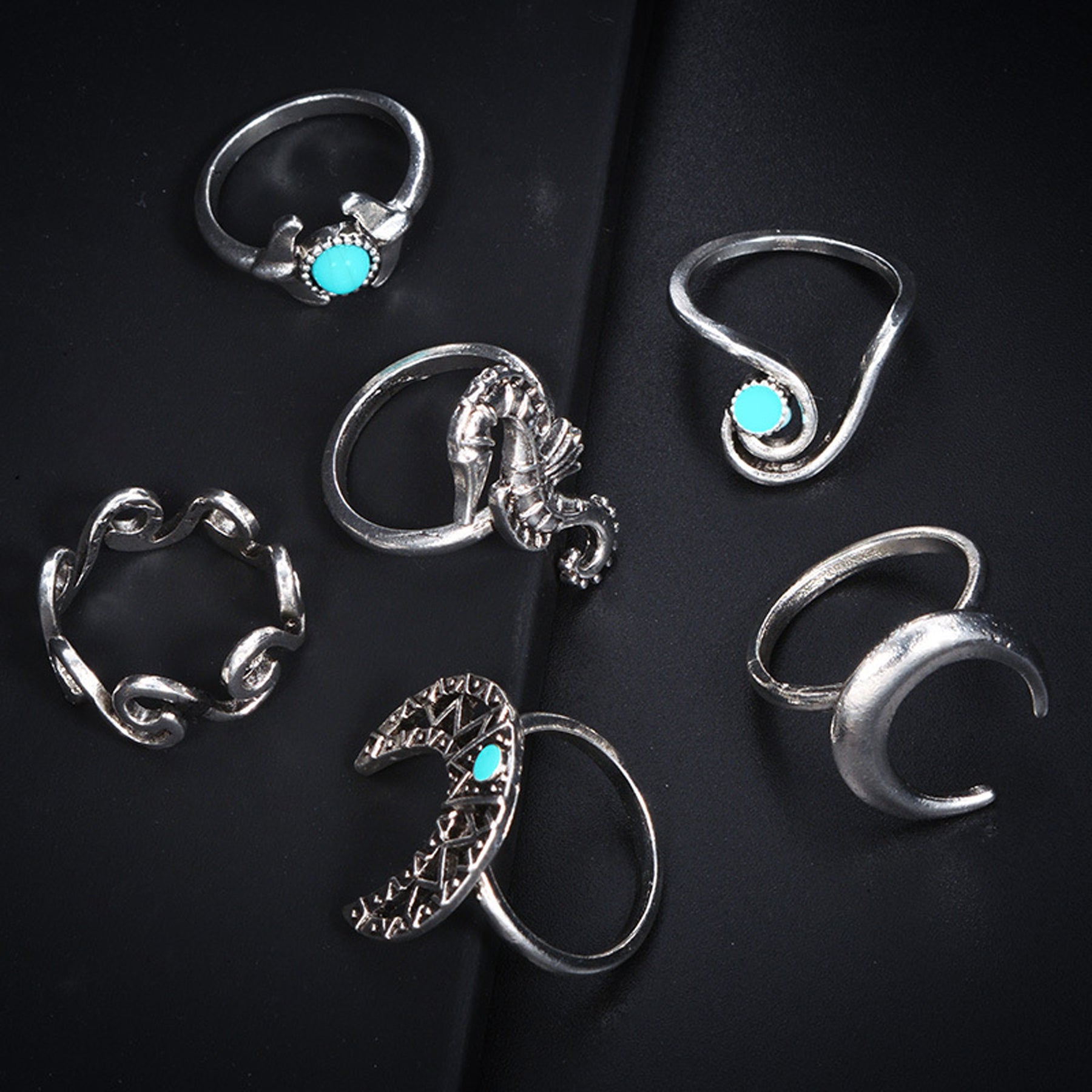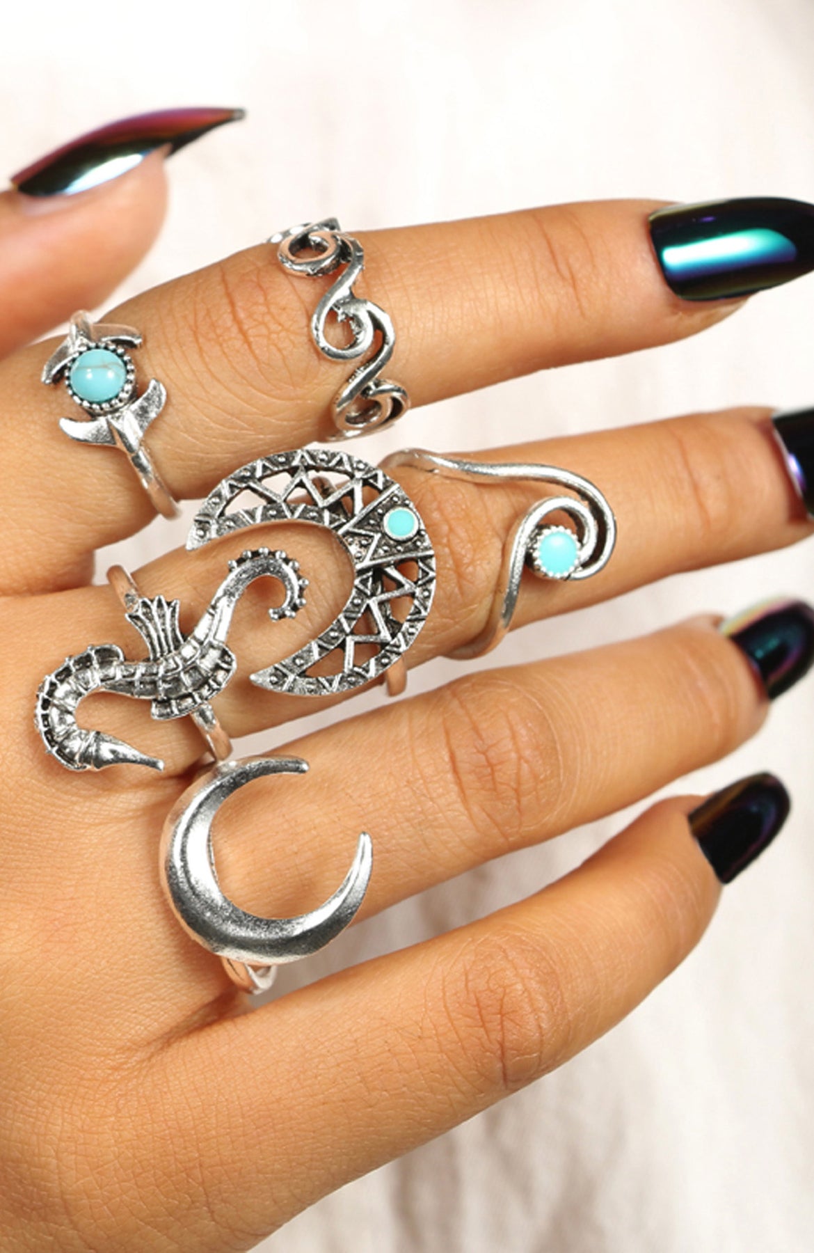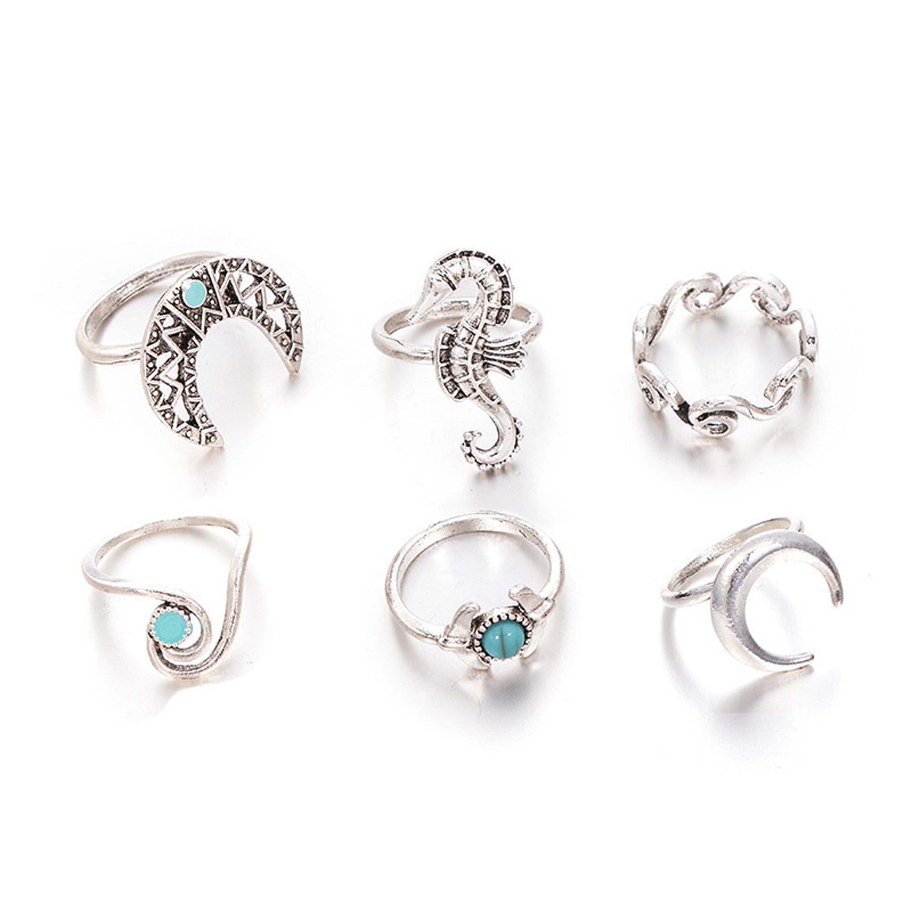 Ariel Boho Chunky Seahorse Moon Beach Turquoise Ring Set in Antiqued Silver 6 Pieces