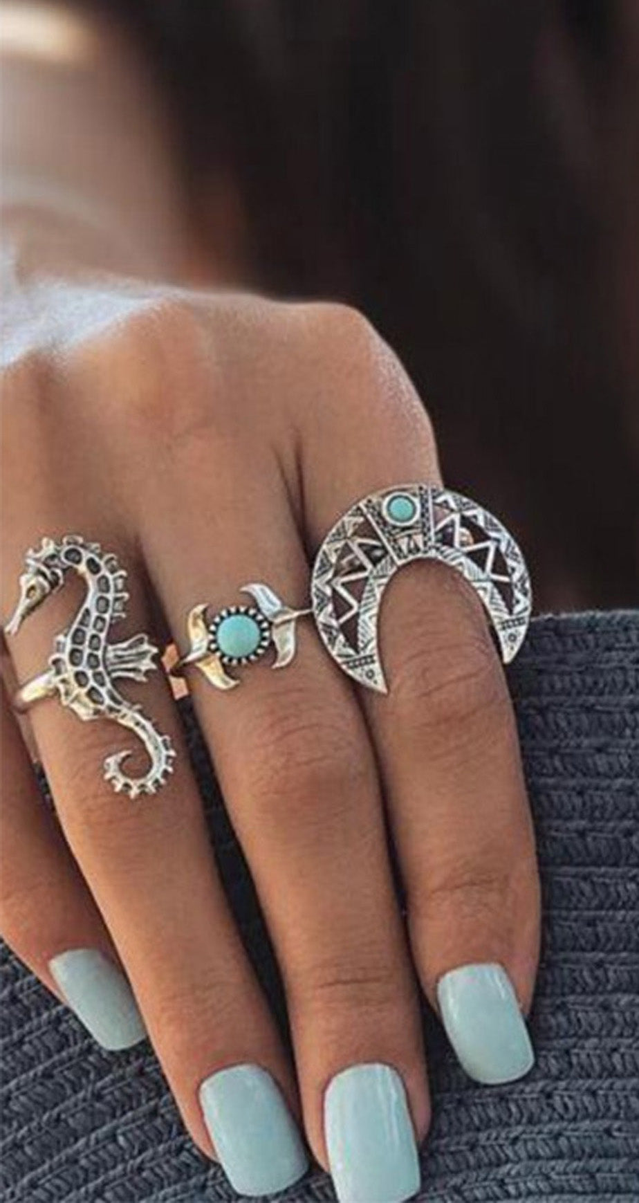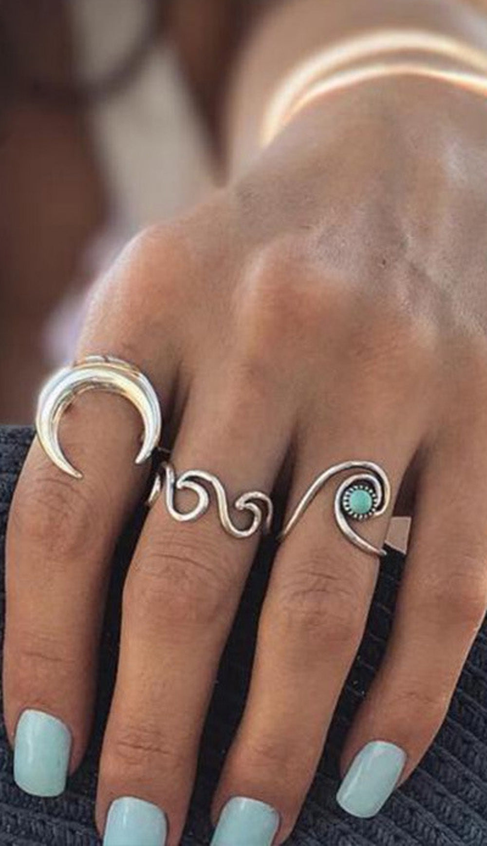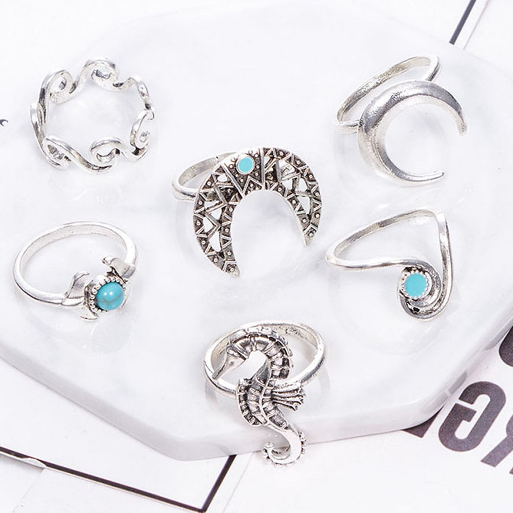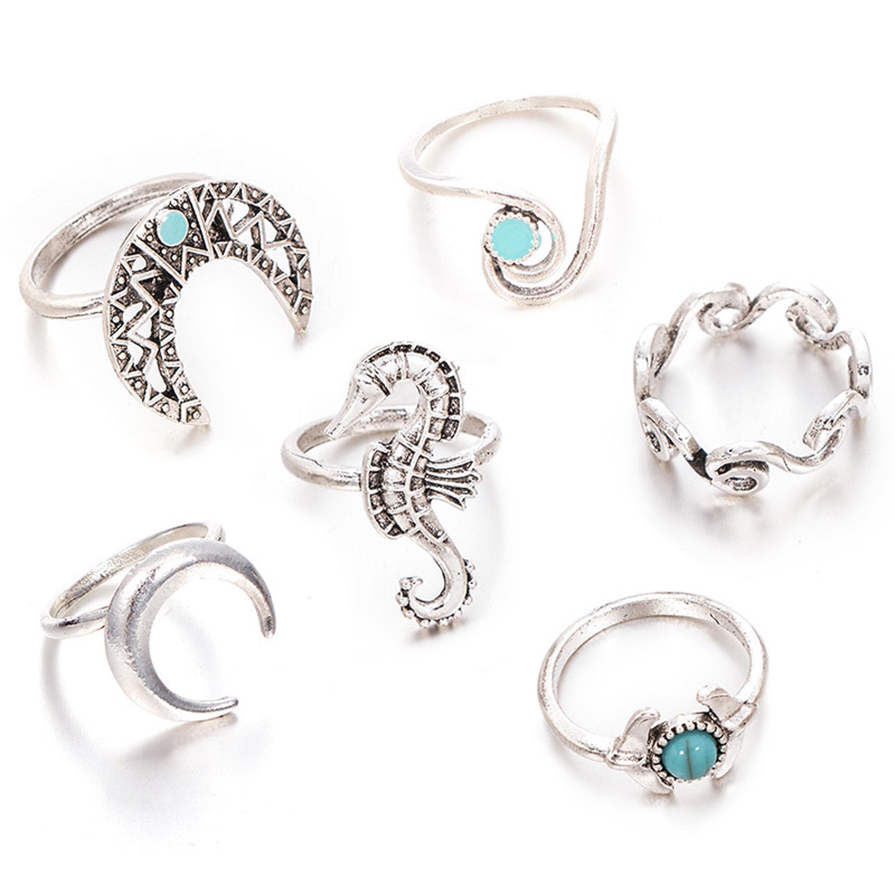 Ariel Boho Chunky Seahorse Moon Beach Turquoise Ring Set in Antiqued Silver 6 Pieces
