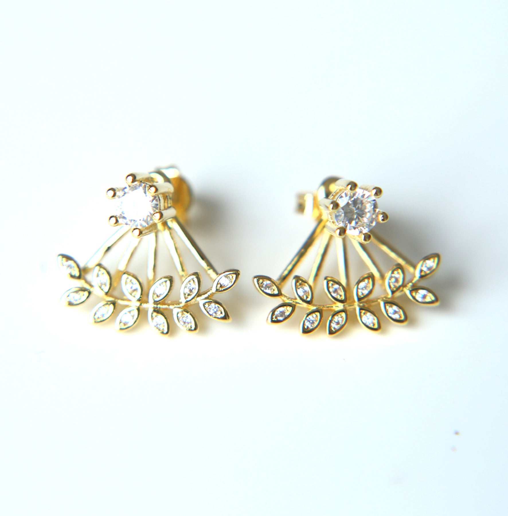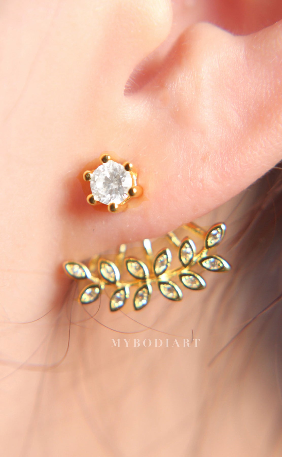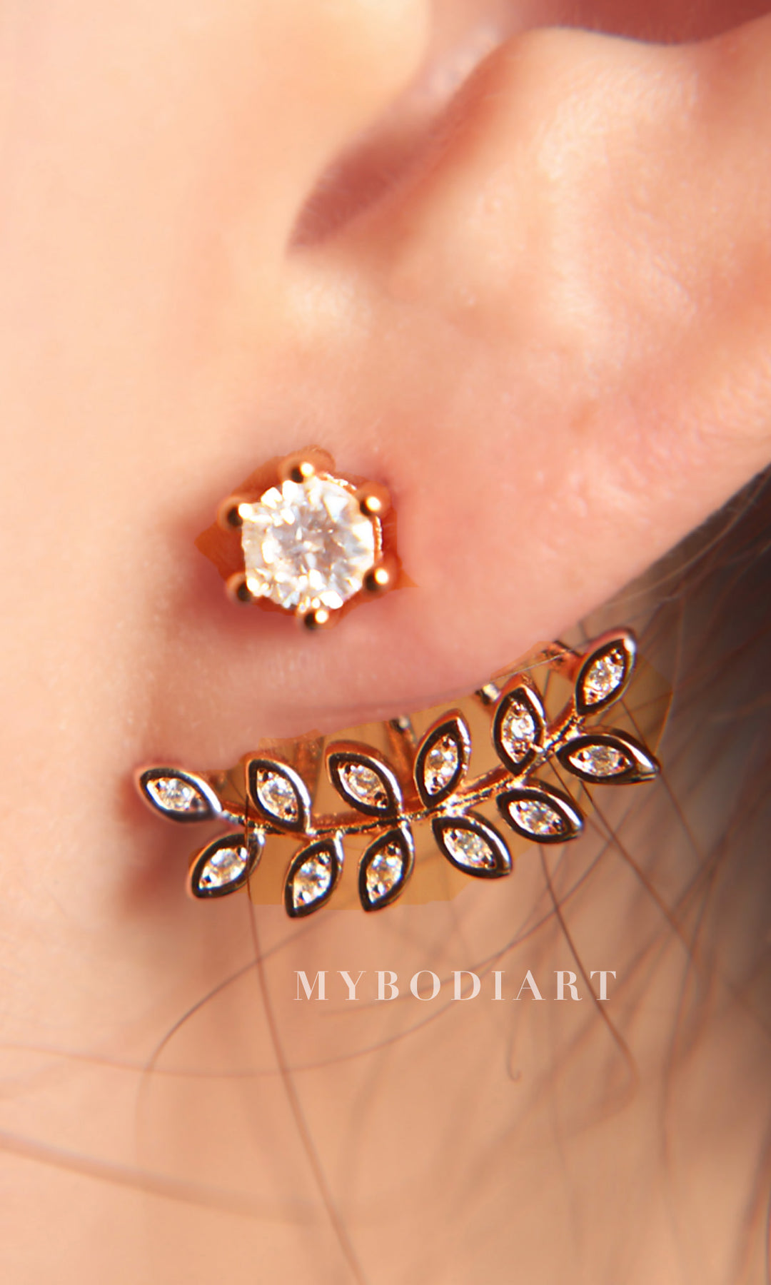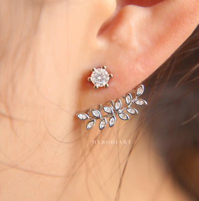 Capella Trendy Cubic Zirconia Crystal Leaf Ear Jacket Stud Earring