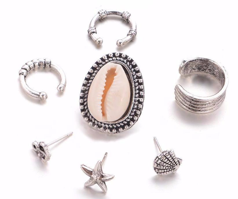 Down By the Beach Antiqued Silver 7 Piece Earring & Ear Cuff Set
