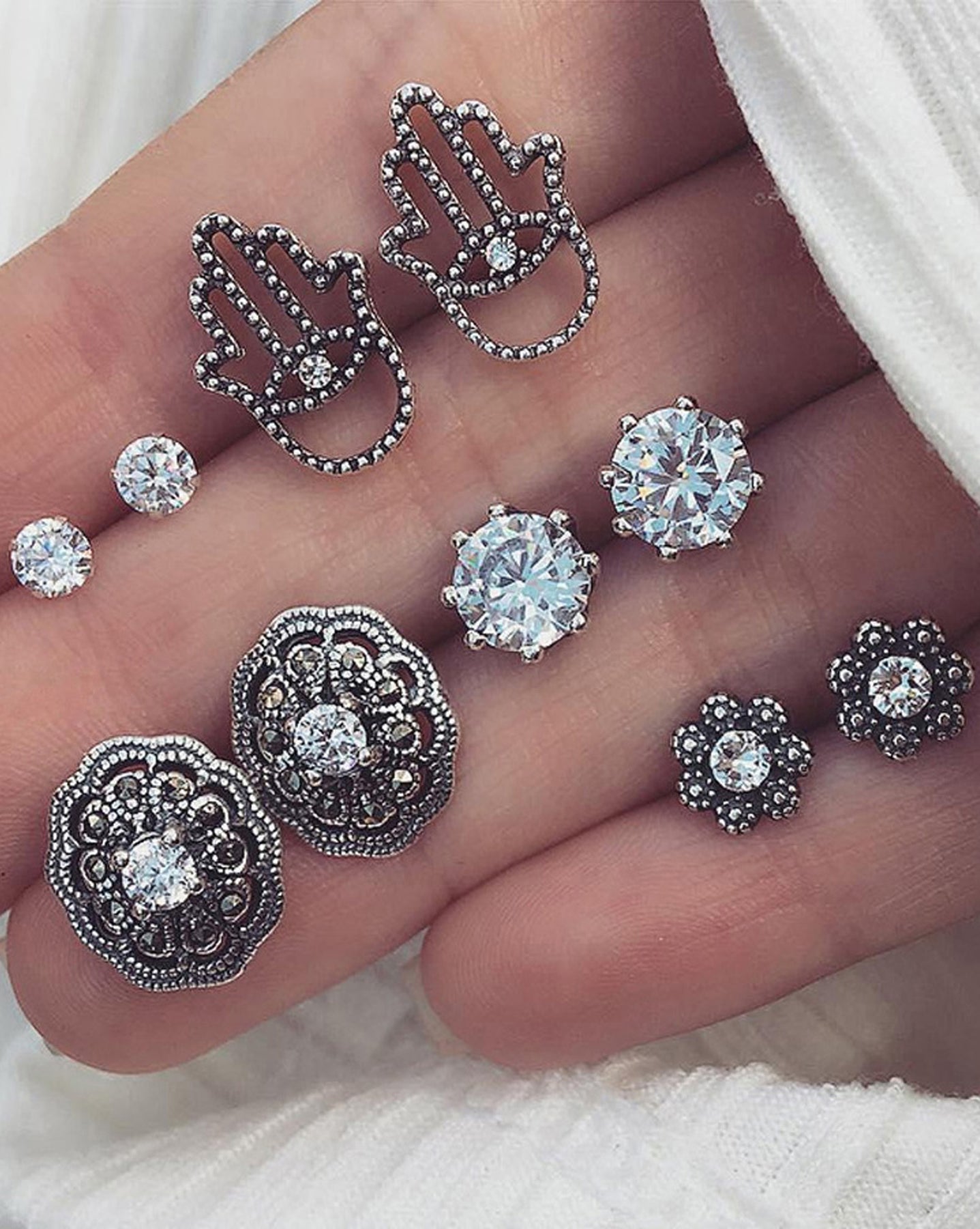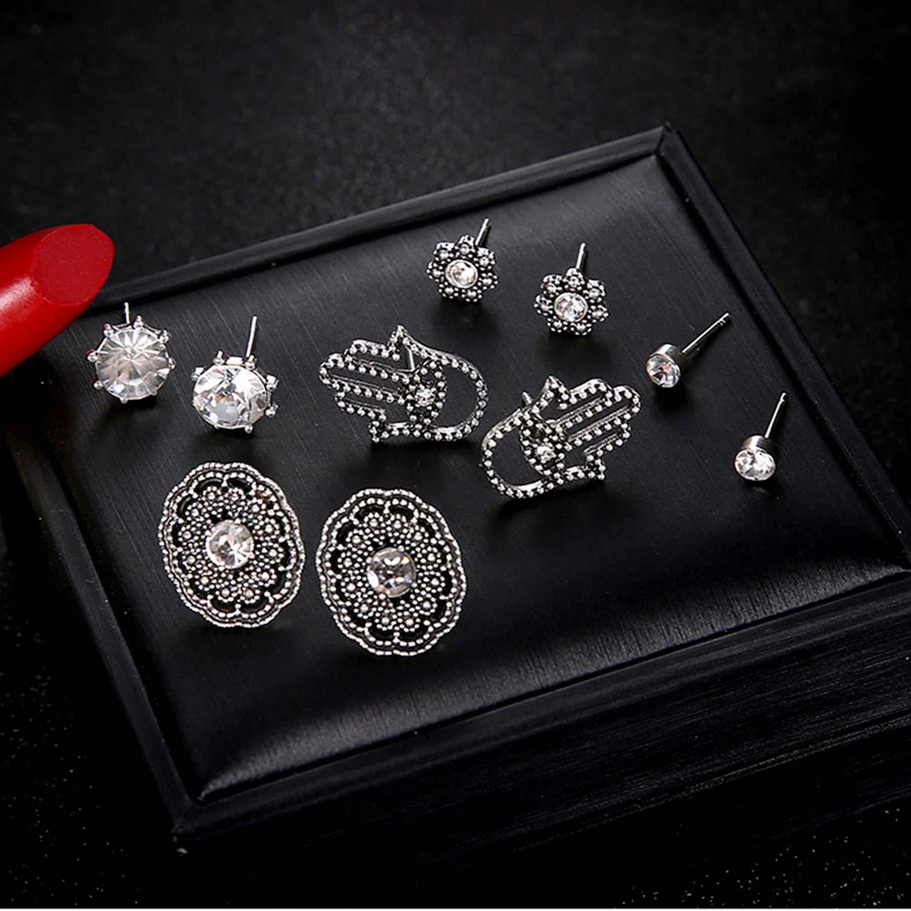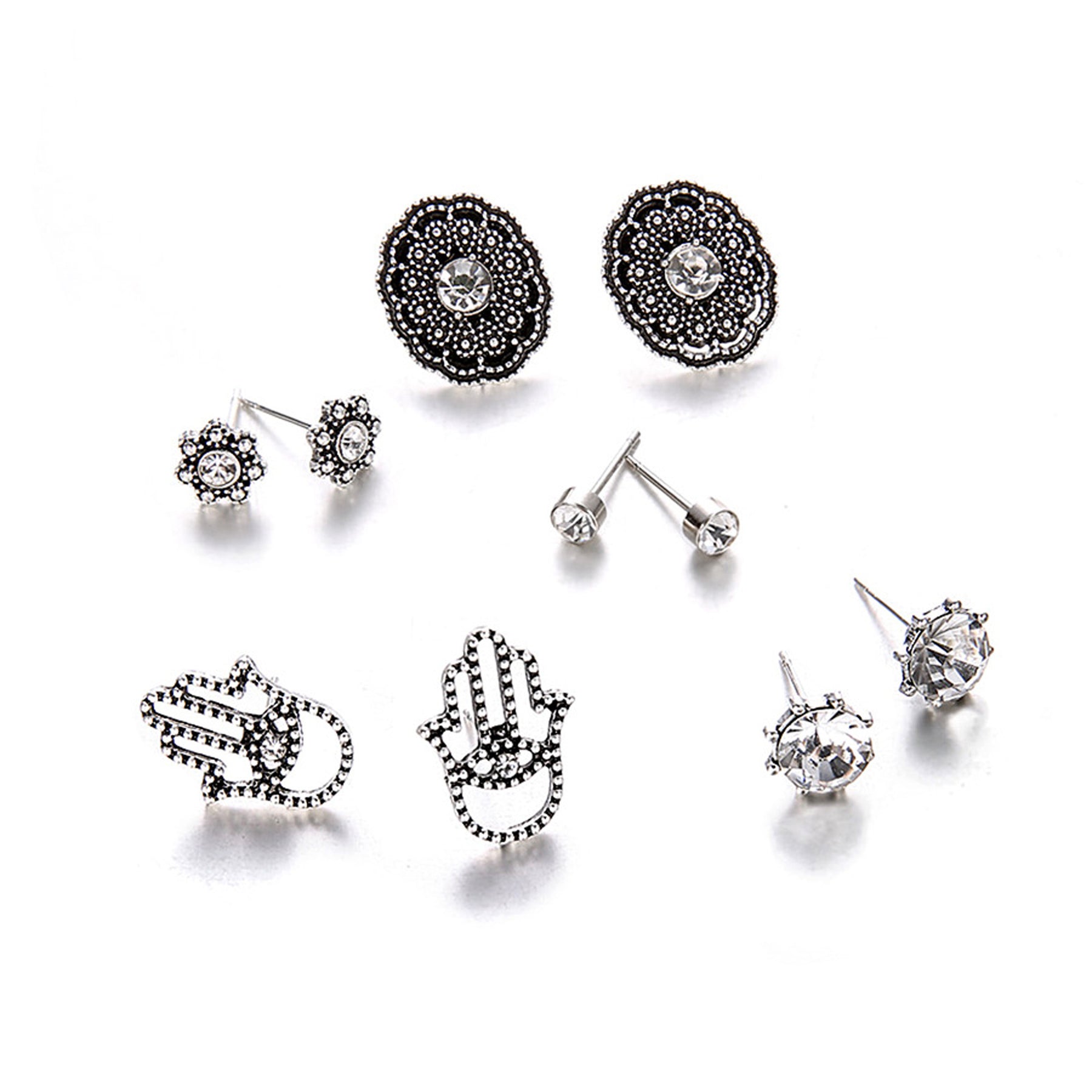 Kaya Vintage Crystal Hamsa Flower Earring Studs Set 5 Pairs in Antiqued Silver