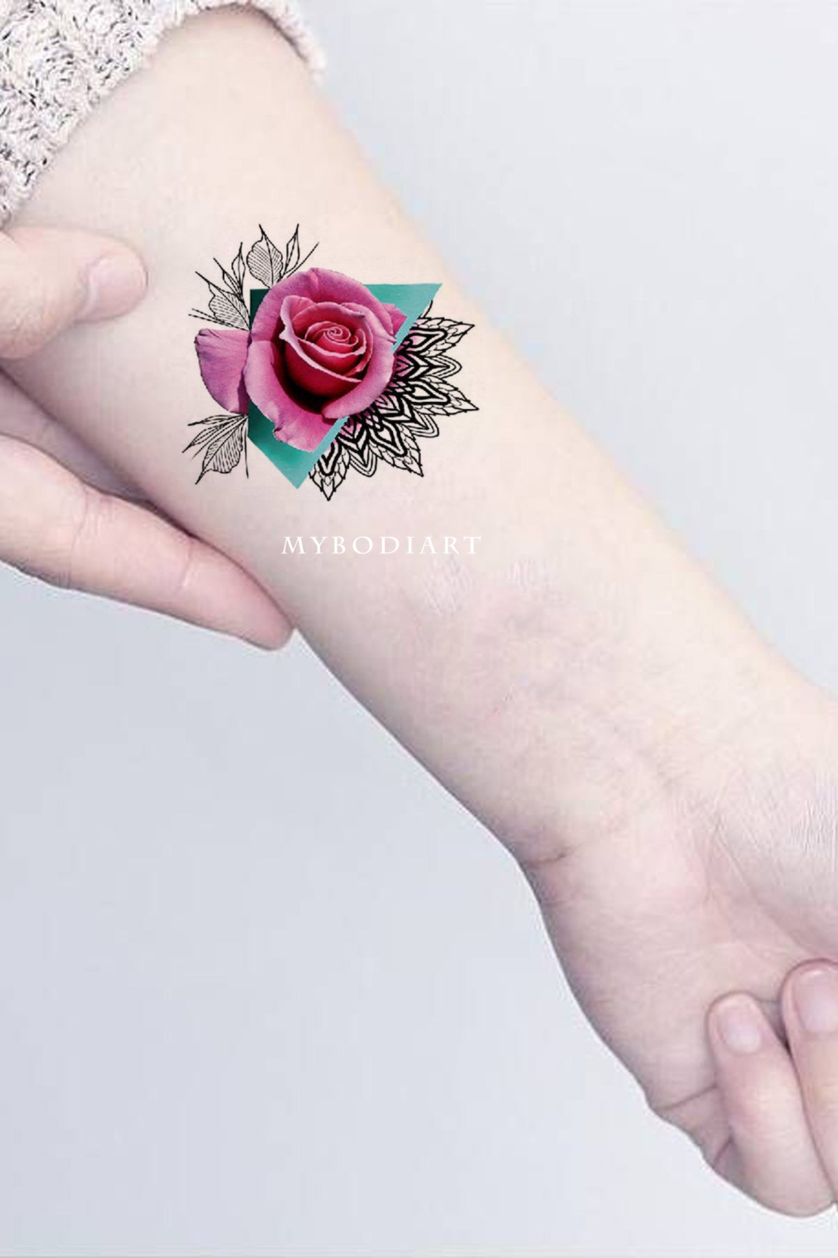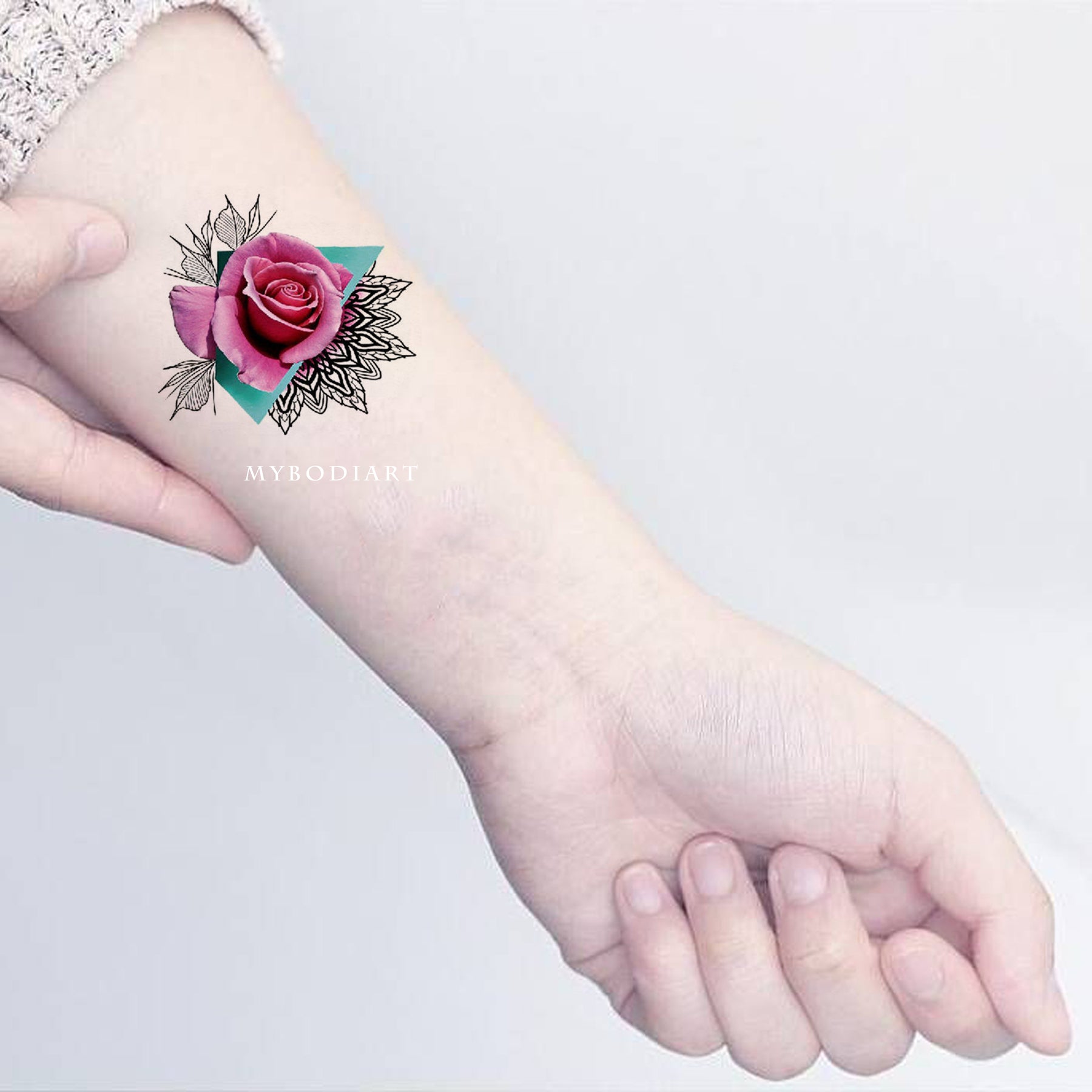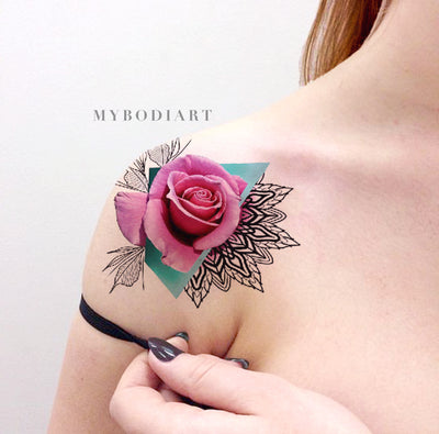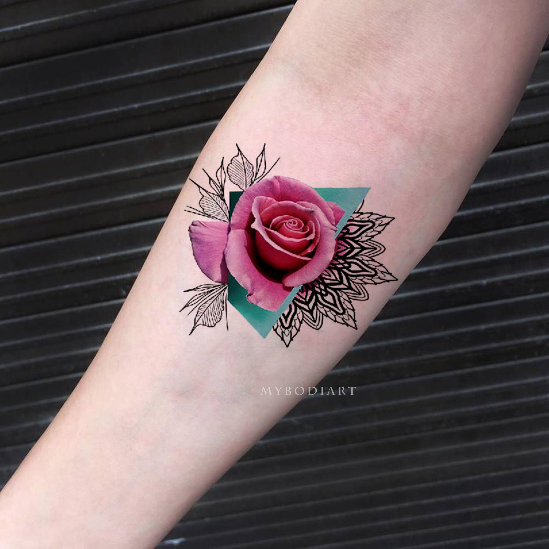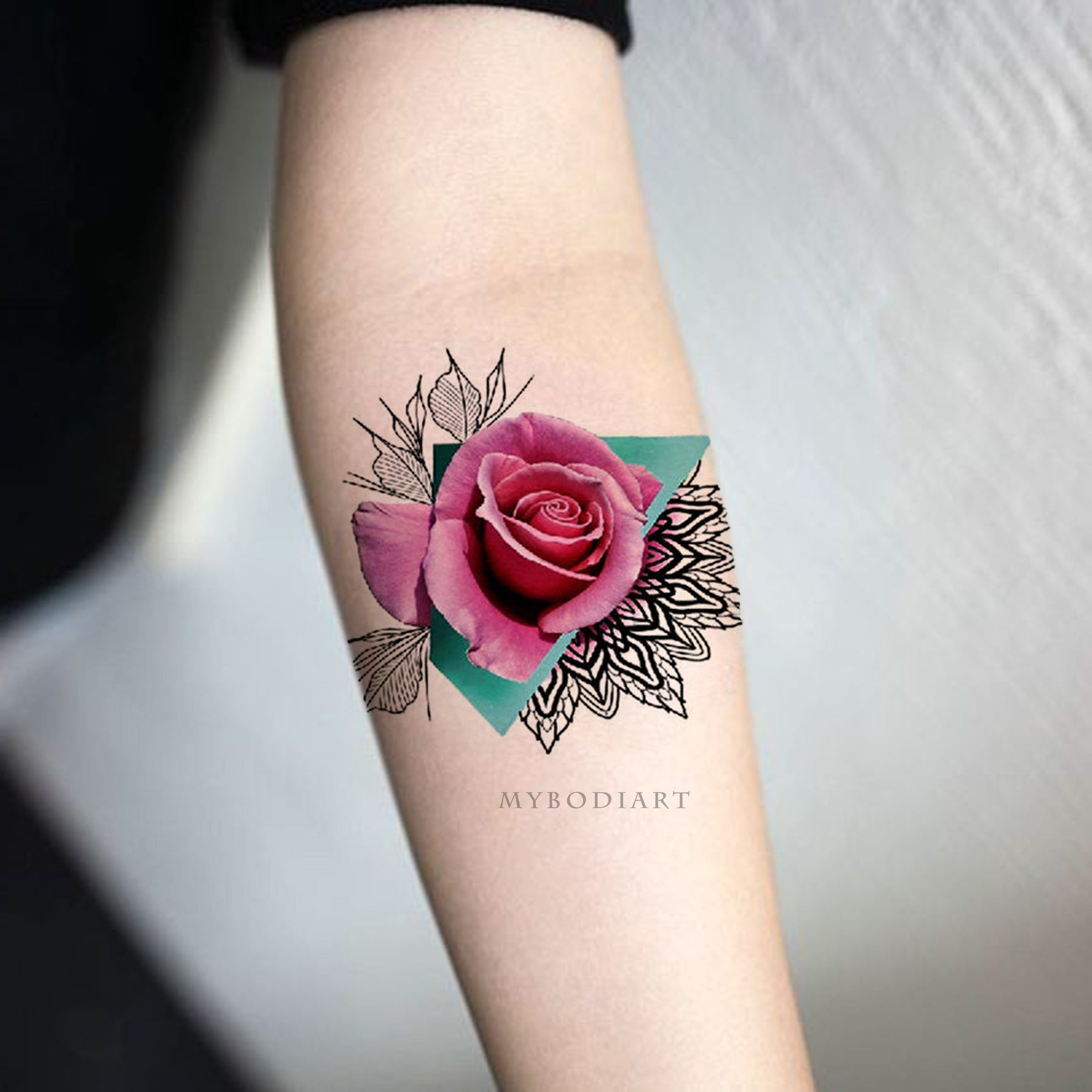 Kaylee Watercolor Pink Rose Geometric Mandala Temporary Tattoo