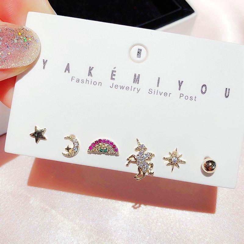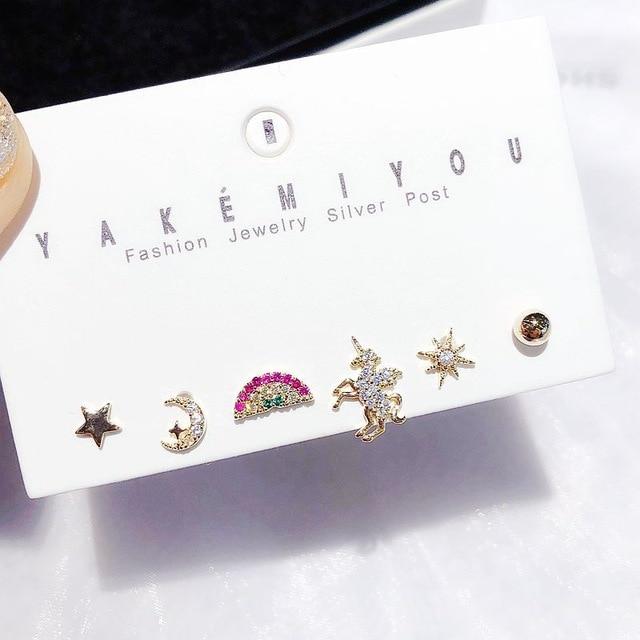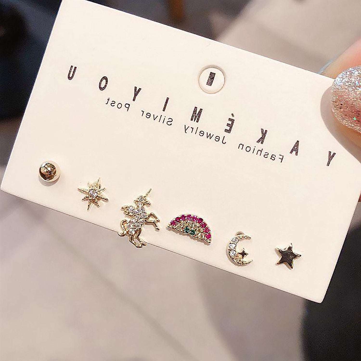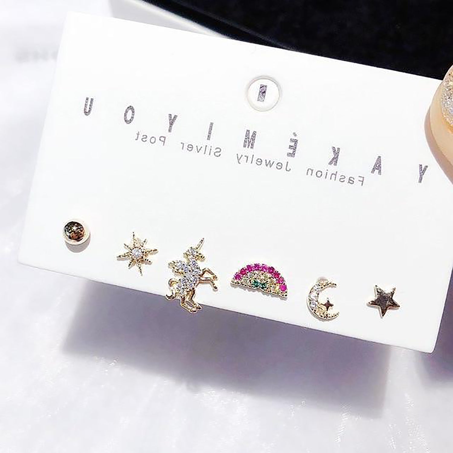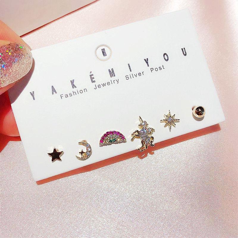 Makena Cute Rainbow Unicorn Star Moon Earring Studs Set 6 Pieces